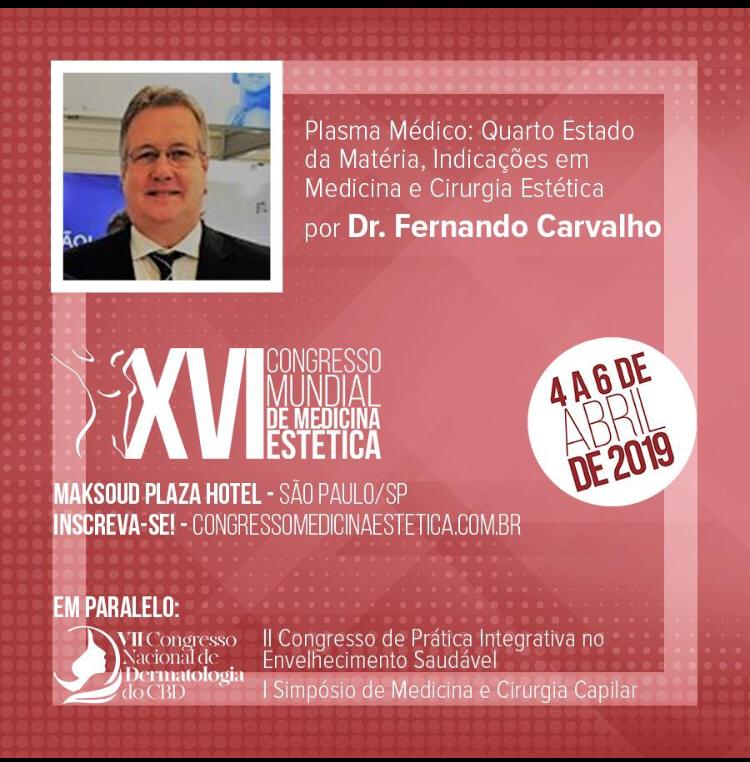 * 2019 – Abril – Palestrante Congresso Mundial de Medicina Estética – ASIME - São Paulo - Brasil. Plasma Médico, quarto estado da matéria, alternativas de tratamentos em Medicina e Cirurgia Cosmética.